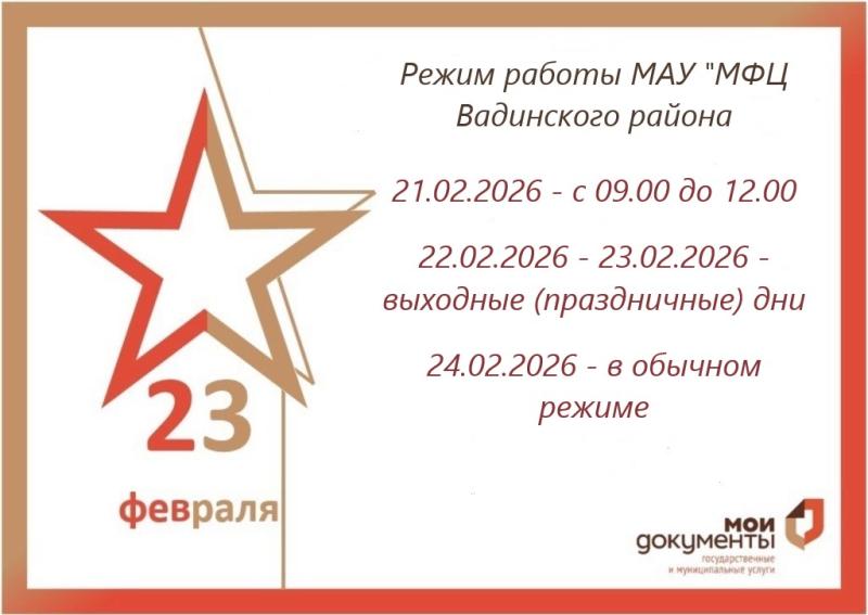 РЕЖИМ РАБОТЫ МАУ «МФЦ ВАДИНСКОГО РАЙОНА» В ПРАЗДНИЧНЫЕ ДНИ